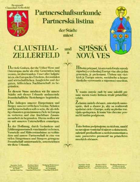 Slávnostné podpísanie partnerskej listiny: 19. septembra 1992 na radnici v nemeckom meste Clausthal-Zellerfeld a následne 27. marca 1993 v koncertnej sále Reduty v Spišskej Novej Vsi