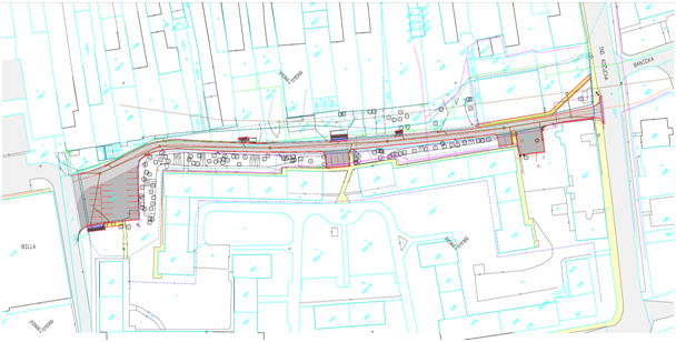 Stručný popis projektu: Projekt bude realizovaný prostredníctvom jednej hlavnej aktivity s názvom „2a) modernizácia miestnych komunikácií“. Na komunikácii ako aj na parkovisku pri OC BILLA bude obnovený povrch z asfaltobetónu, zriadené budú nové obrubníky, pričom trasa komunikácie bude plynulo zaoblená. Na ostatných parkovacích plochách sa vytvorí nový povrch z asfaltobetónu. Povrch chodníkov sa zjednotí – použije sa betónová zámková dlažba a obnovia sa tiež plochy pre umiestnenie nádob na odpad. Obslužná komunikácia po prestavbe bude jednosmerná jednopruhová. Parkovacie plochy sú navrhované pre kolmé státie vozidiel. Rozmery parkovacích miest sú 2,50 x 5,0 m (pri parkovacom mieste pre vozidlá občanov so zníženou schopnosťou pohybu a orientácie bude šírka státia zväčšená na 3,50 m). Projekt ďalej rieši odvedenie dažďových vôd z rekonštruovanej cesty a čiastočne z priľahlej plochy nachádzajúcej sa nad riešenou komunikáciou a taktiež výmenu existujúcich stĺpov verejného osvetlenia obslužnej komunikácie.